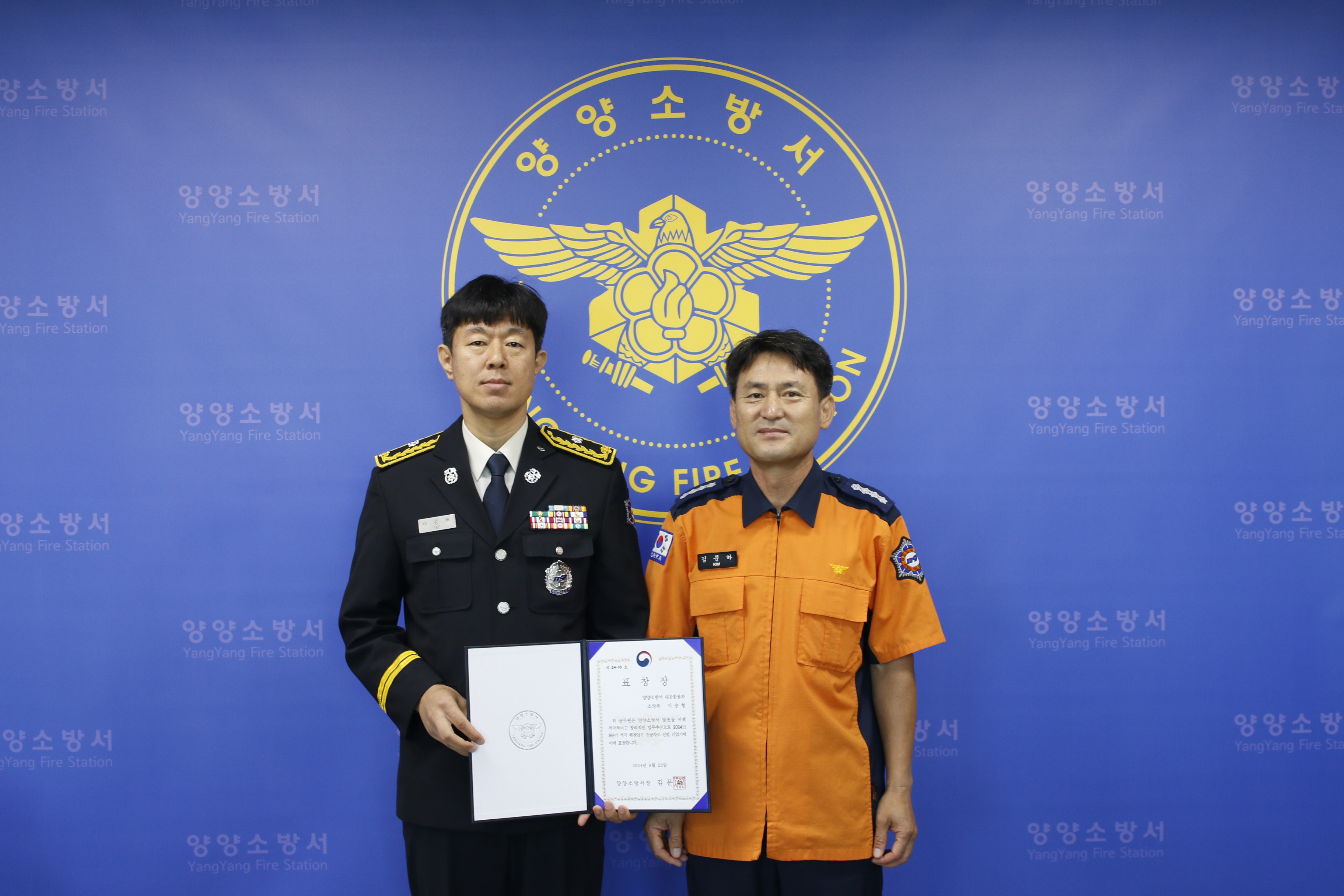 양양소방서(서장 김문하)는 23일 본서 서장실에서 3분기 적극행정 우수 공무원에 대한 표창 수여식을 진행했다고 밝혔다.